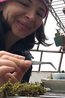In the winter of 2020 Serena started making feel good gnomes, bodies made of branches and beards of lichen, sometimes adorned with moss. The noses are made out of plastic bags (destined for the trash) so they are waterproof covered in fabric, to which the hats are connected to and mittens that match. They all come together as a set that can be reused year after year.